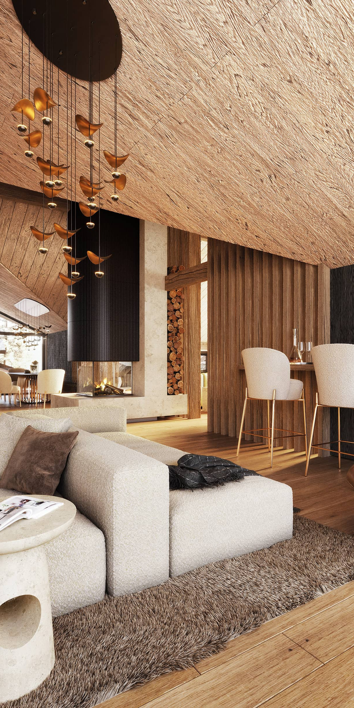 Hier trifft architektonische Großzügigkeit auf alpine Gemütlichkeit: ein offener Kamin, eine maßgefertigte Küche, ein Spiel aus Licht und Material. Die Terrassen umfassen den Raum wie ein Amphitheater und öffnen den Blick auf die Leoganger Steinberge.