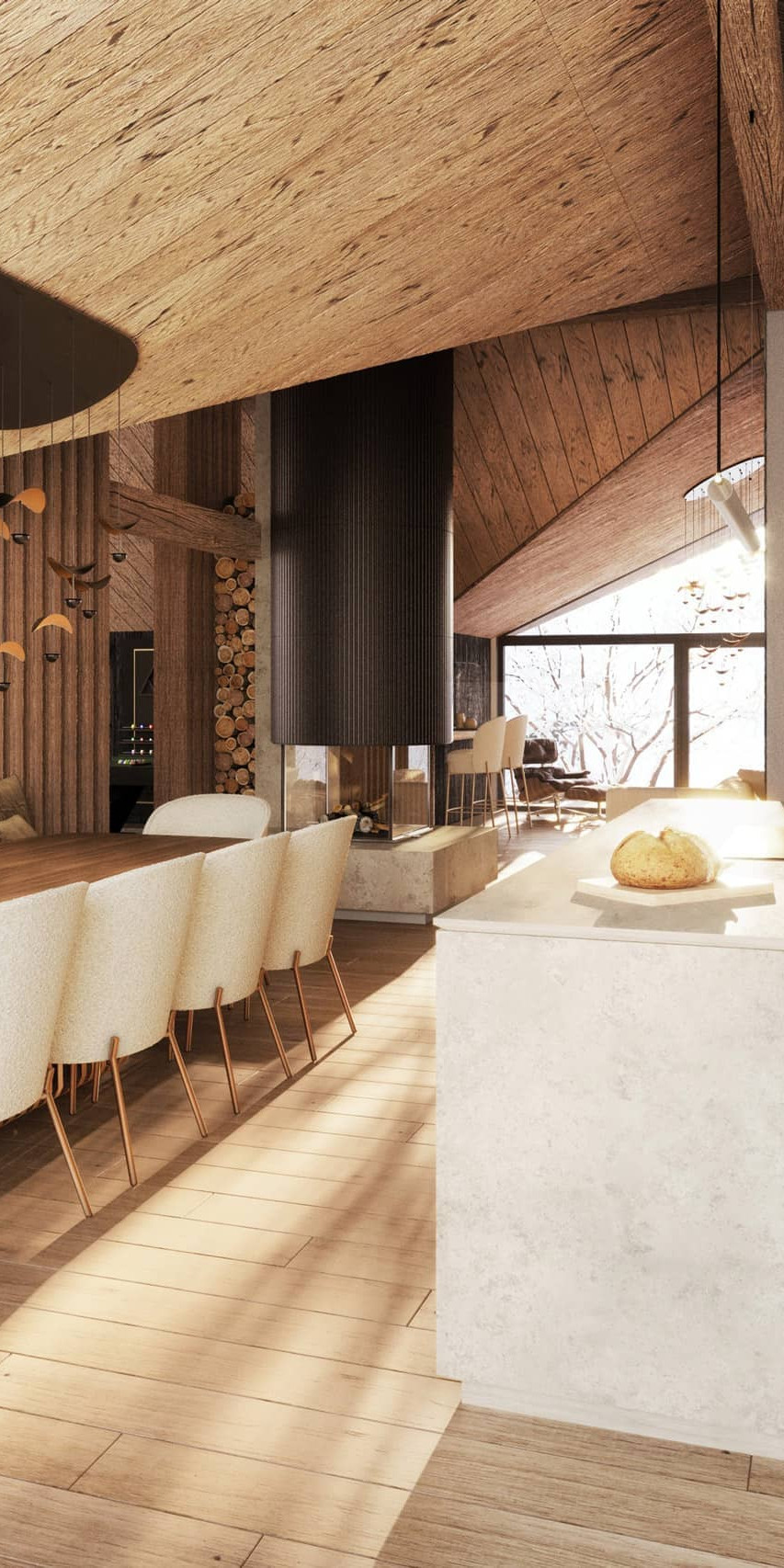 Das Herz der Residenz bildet die Wohnebene mit 127 m² Wohn-, Ess- und Kochbereich. Ein Raum für Begegnung – fließend, lichtdurchflutet und offen zum Bergpanorama.