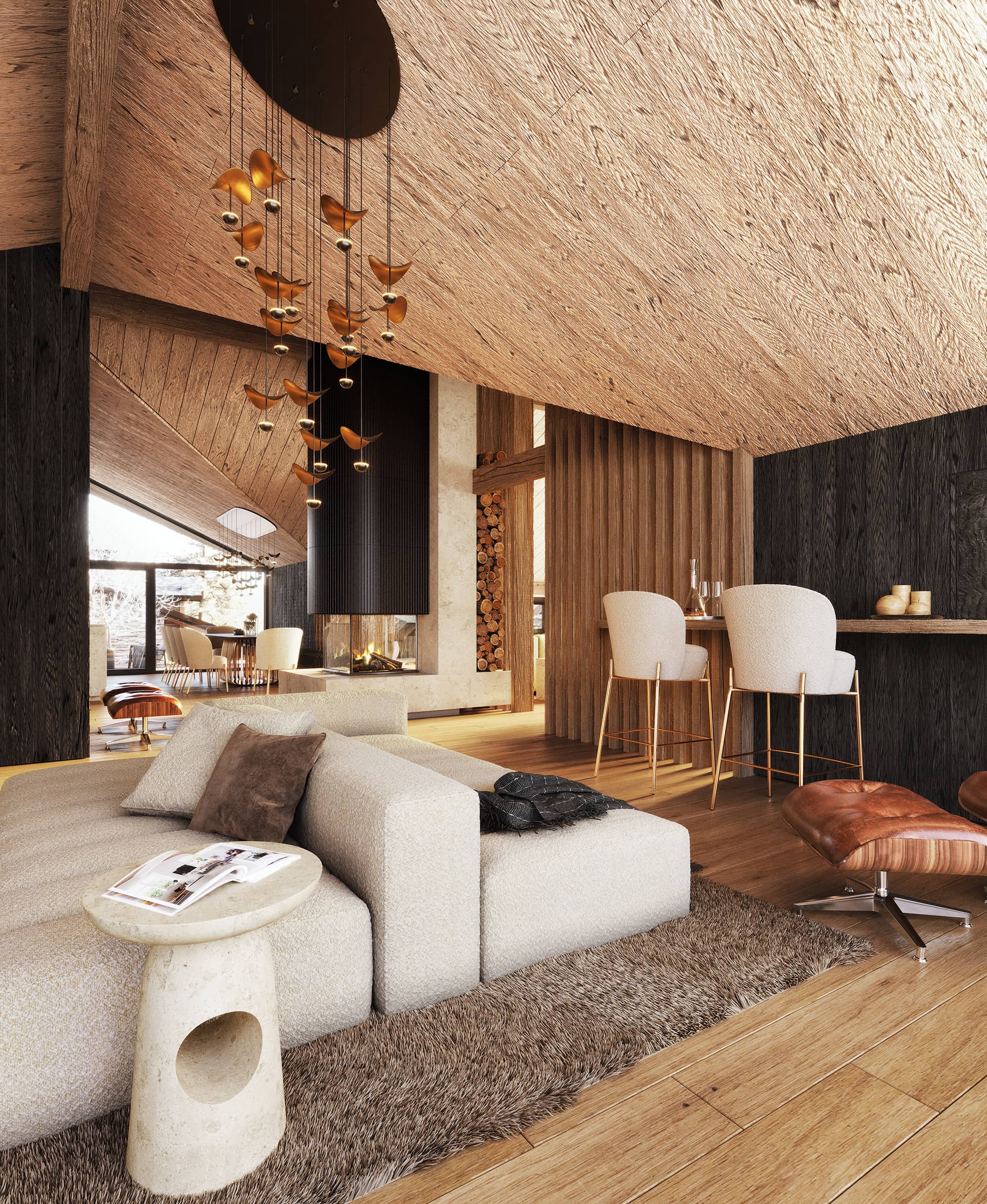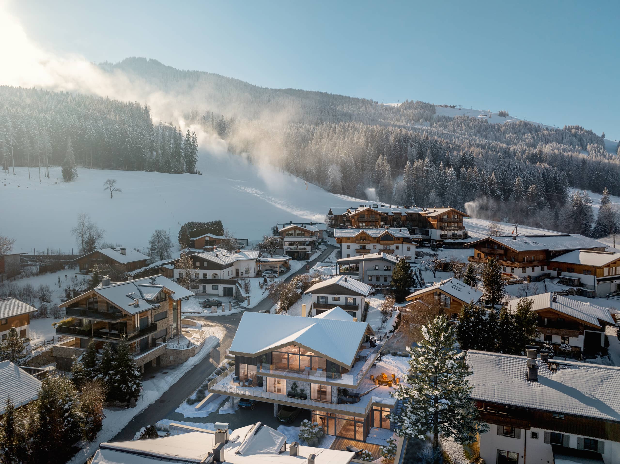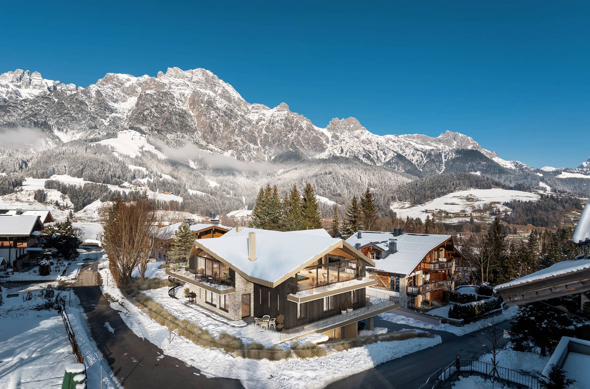 Hier trifft architektonische Großzügigkeit auf alpine Gemütlichkeit: ein offener Kamin, eine maßgefertigte Küche, ein Spiel aus Licht und Material. Die Terrassen umfassen den Raum wie ein Amphitheater und öffnen den Blick auf die Leoganger Steinberge.