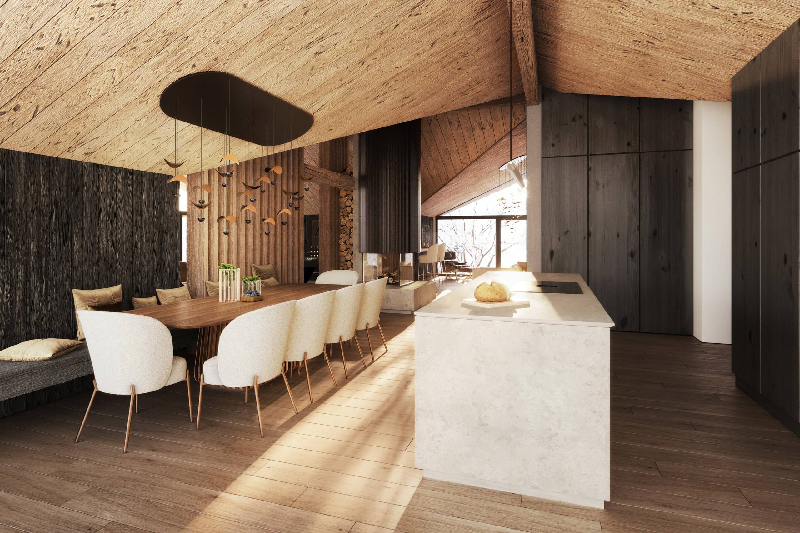 Das Herz der Residenz bildet die Wohnebene mit 127 m² Wohn-, Ess- und Kochbereich. Ein Raum für Begegnung – fließend, lichtdurchflutet und offen zum Bergpanorama.